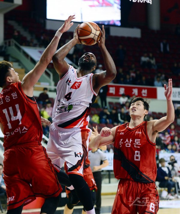 17일 경기도 안양실내체육관에서 열린 ‘2018-2019 SKT 5GX 프로농구’ 안양 KGC와 부산 KT의 경기에서 KT 랜드리가 KGC 김승원의 수비를 피해 슛을 쏘고 있다.