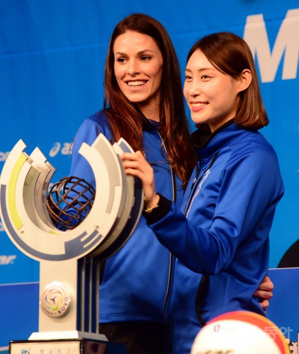 18일 서울 청담동 리베라호텔에서 ‘2018-2019 도드람 V리그’ 미디어데이가 열렸다. 한국도로공사 이바나와 배유나가 트로피 앞에서 포즈를 취하고 있다.