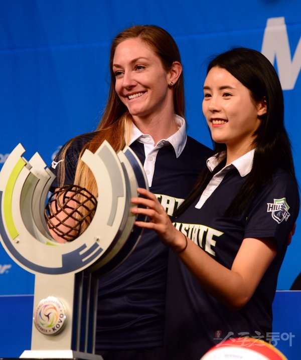 18일 서울 청담동 리베라호텔에서 ‘2018-2019 도드람 V리그’ 미디어데이가 열렸다. 현대건설 베키와 이다영이 트로피 앞에서 포즈를 취하고 있다.
