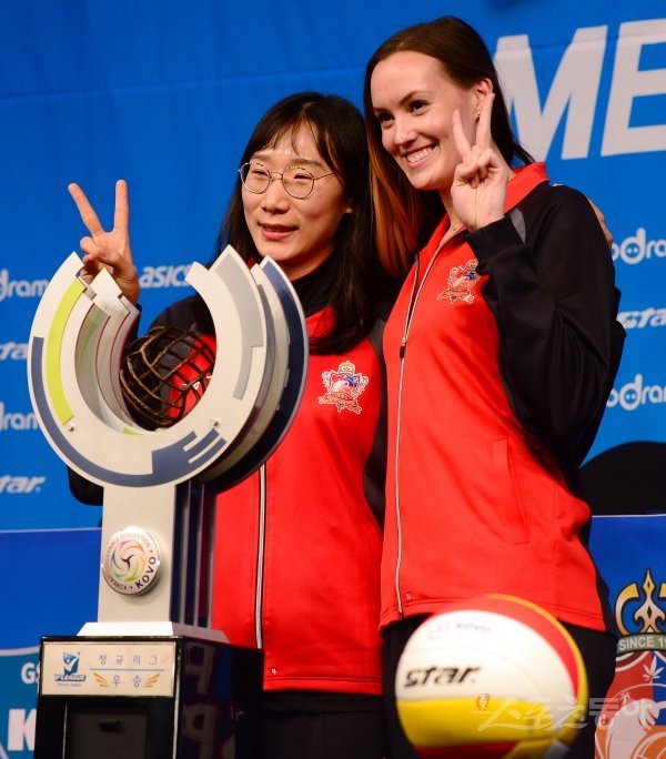 18일 서울 청담동 리베라호텔에서 ‘2018-2019 도드람 V리그’ 미디어데이가 열렸다. KGC인삼공사 한수지와 알레나가 트로피 앞에서 포즈를 취하고 있다.