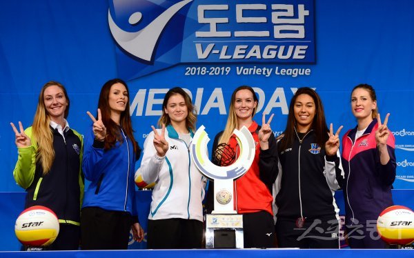 18일 서울 청담동 리베라호텔에서 ‘2018-2019 도드람 V리그’ 미디어데이가 열렸다. 베키, 이바나, 알리, 알레나, 어나이, 톰시아가 카메라를 향해 포즈를 취하고 있다.
