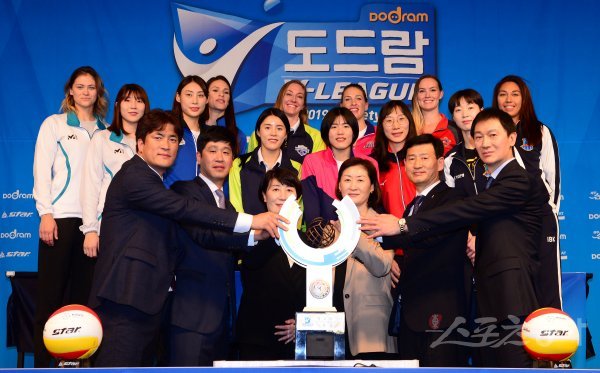 18일 서울 청담동 리베라호텔에서 ‘2018-2019 도드람 V리그’ 미디어데이가 열렸다. 6개 구단 감독 및 선수들이 카메라를 향해 포즈를 취하고 있다.