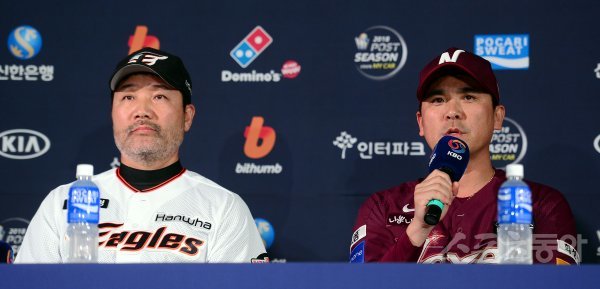 18일 충남 대전 모임공간국보 대회의실에서 한화이글스와 넥센히어로즈가 맞붙는 ‘2018 신한은행 MY CAR KBO리그’ 준플레이오프 미디어데이에서 한화 한용덕 감독과 넥센 장정석 감독이 취재진의 질문에 대답하고 있다.