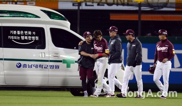 타구를 잡아낸 뒤 왼쪽 어깨가 그라운드에 닿은 상황에서 몸이 오른쪽으로 돌아가는 바람에 왼 팔이 심하게 꺾인 것이다. 곧장 트레이너가 달려나와 이정후의 상태를 살폈고, 급기야 구급차까지 들어왔다. 일단 트레이너의 부축을 받으며 벤치로 향한 이정후는 김규민과 교체돼 그라운드를 떠났다. 경기 후 만난 이정후는 왼 팔에 붕대를 감고 있었고, 넥센 구단관계자는 “아이싱을 한 뒤 가까운 응급실로 이동해 바로 검진을 받을 예정”이라고 밝혔다.