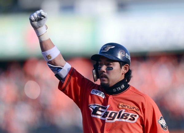 20일 대전 한화생명이글스파크에서 한화이글스와 넥센히어로즈가 맞붙는 ‘2018 신한은행 MY CAR KBO리그’ 준플레이오프 2차전이 열렸다. 4회말 무사 만루 한화 이용규가 동점을 만드늩 2타점 중전 안타를 치고 1루에서 기뻐하고 있다.