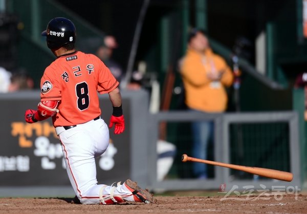 20일 대전 한화생명이글스파크에서 한화이글스와 넥센히어로즈가 맞붙는 ‘2018 신한은행 MY CAR KBO리그’ 준플레이오프 2차전이 열렸다. 4회말 무사 한화 정근우가 사구를 맞고 고통스러워 하고 있다.