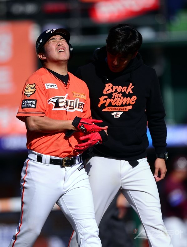 20일 대전 한화생명이글스파크에서 한화이글스와 넥센히어로즈가 맞붙는 ‘2018 신한은행 MY CAR KBO리그’ 준플레이오프 2차전이 열렸다. 2회말 2사 1,3루 한화 정근우가 사구를 맞고 고통스러워 하고 있다.