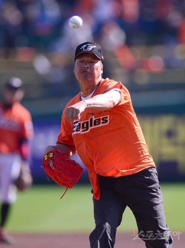 20일 대전 한화생명이글스파크에서 한화이글스와 넥센히어로즈가 맞붙는 ‘2018 신한은행 MY CAR KBO리그’ 준플레이오프 2차전이 열렸다. 경기 전 구대성 질롱코리아 감독이 시구를 하고 있다.