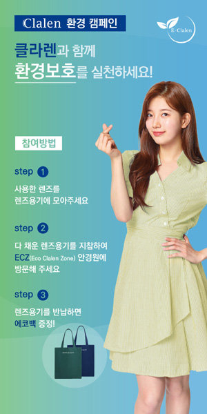 콘택트렌즈 전문 제조기업 인터로조의 대표 브랜드 클라렌은 12월까지 폐렌즈를 수거하는 ‘에클라렌’(e-clalen) 환경 캠페인(사진)을 진행한다. 캠페인 참여 매장에 방문해 브랜드에 관계없이 사용한 렌즈를 수거 용기에 넣으면 된다. 참여자에게는 에코백을 증정한다. 캠페인 참여 후 엠블럼과 함께 #클라렌, #에클라렌, #환경보호 해시태그를 달고 캠페인 동참 이유를 개인 SNS에 업로드하면 200명에게 아이스크림 기프티콘을 증정한다. 이번 환경 캠페인은 100개 매장에서 실시하며, 내년에 전국적으로 확대할 예정이다.