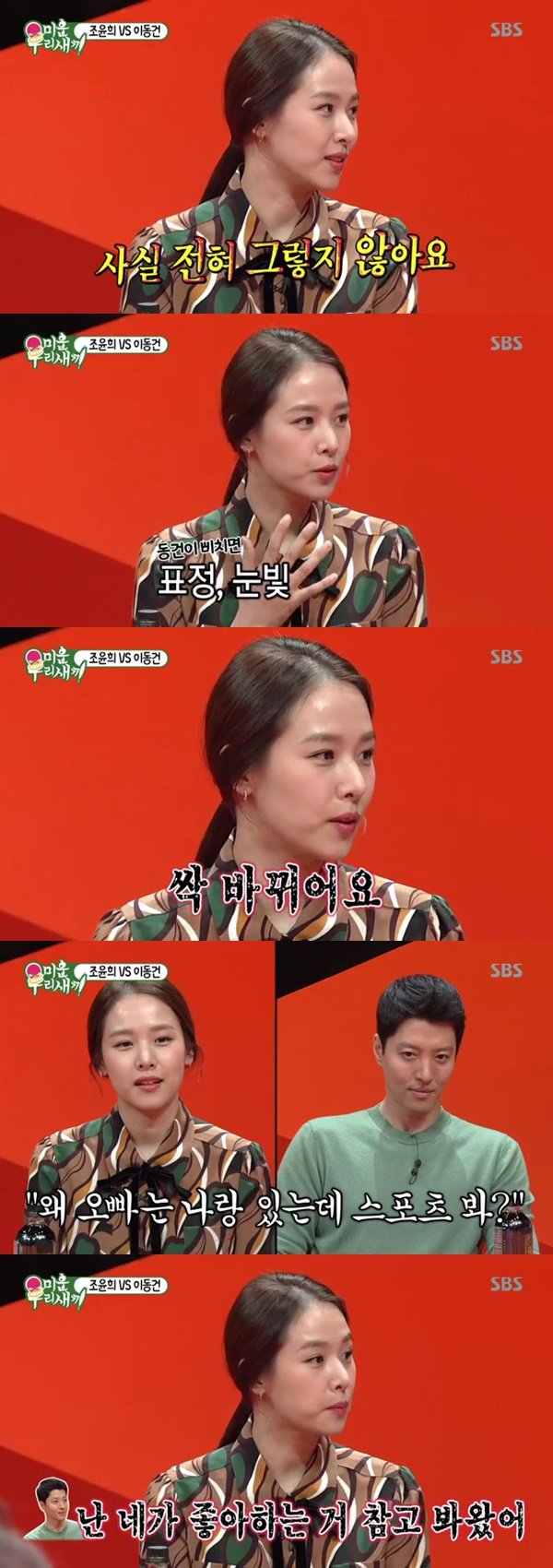 이날 조윤희는 앞서 이동건이 방송에서 “조윤희가 눈치가 없다”고 말한 것에 대해 “전혀 그렇지 않다. 남편이 삐치면 말투부터 싹 바뀐다. 그래서 모를 수가 없다”고 말했다.