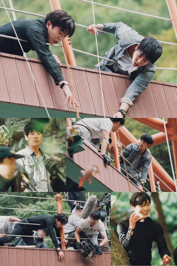 역대급 명장면 뒤에는 배우와 스태프들의 뜨거운 열정이 있었다. 공개된 현장 비하인드에 담긴 현장의 후끈한 에너지가 이목을 집중한다. 24시간 윤화평 빙의 모드인 김동욱은 ‘손’에 빙의돼 위기에 직면한 아버지를 구하려는 절절한 감정을 곱씹으며 진지하게 몰입하고 있다. 환한 미소로 현장 분위기를 밝히다가도 촬영에 돌입하면 날카롭고 짙은 눈빛으로 돌변하는 김재욱의 반전도 흥미롭다. 사소한 동선, 시선까지 꼼꼼하게 의논하고 온몸을 내던져 연기력과 감정을 폭발시키는 김동욱과 김재욱의 시너지는 그 자체만으로 흡인력을 높인다.