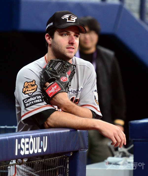 경기에 앞서 한화 헤일이 그라운드를 바라보고 있다.