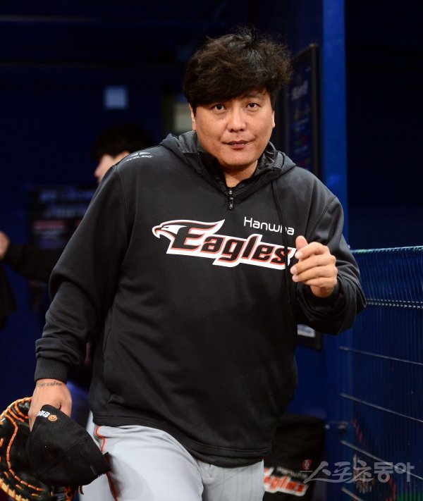 경기에 앞서 한화 김태균이 그라운드로 나서고 있다.