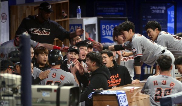 2회초 무사 1,2루 한화 하주석의 선제 1타점 적시타 때 득점한 이성열이 더그아웃에서 하이파이브 하고 있다.