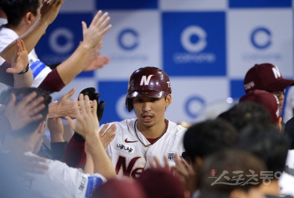 5회말 1사 2루에서 넥센 김규민이 서건창의 2루타 때 득점에 성공한 후 덕아웃에서 동료들의 축하를 받고 있다.