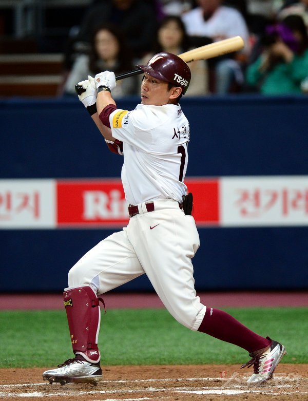 5회말 1사 2루에서 넥센 서건창이 1타점 2루타를 날리고 있다.