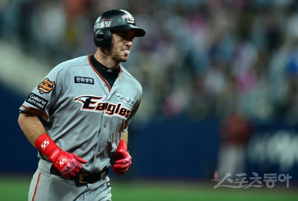 6회초 2사에서 한화 호잉이 넥센 선발 브리검을 상대로 우월 솔로 홈런을 쏘아 올린 뒤 껌을 씹고 있다.