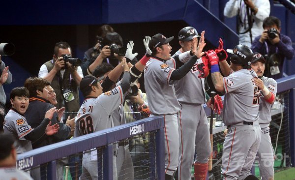9회초 1사 1루 한화 김태균이 역전 1타점 중전 2루타를 치고 대주자와 교체된 후 더그아웃에서 하이파이브 하고 있다.