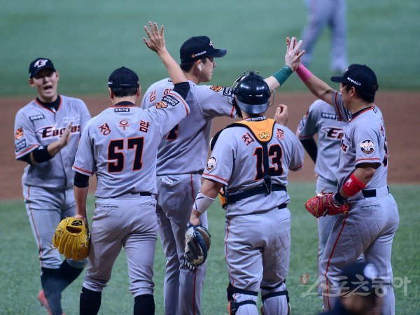 4-3 승리를 거두며 2연패 뒤에 귀중한 1승을 거둔 한화 선수들이 하이파이브 하고 있다.