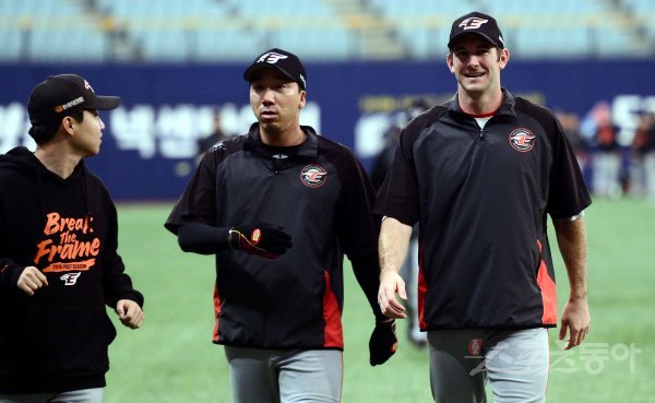 경기에 앞서 한화 호잉이 스트레칭 훈련을 마치고 더그아웃으로 향하고 있다.