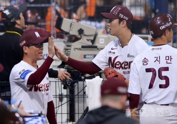 넥센 안우진이 5회초를 무실점으로 막은 후 덕아웃에서 장정석 감독(왼쪽)과 하이파이브를 하고 있다.