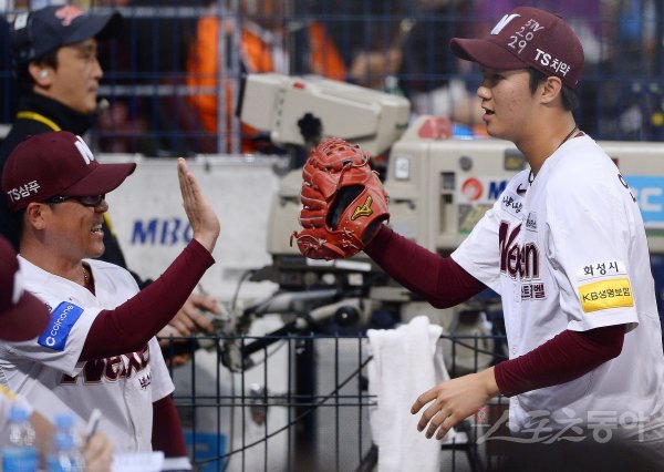 8회초 1사 넥센 안우진이 한화 최재훈을 유격수 앞 땅볼로 병살타를 만들어내며 이닝을 무실점으로 막은 후 덕아웃에서 장정석 감독과 하이파이브를 하고 있다.