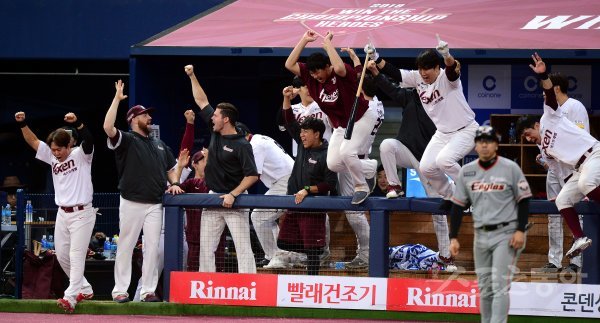 넥센이 한화에 5-2로 승리하며 PO에 진출하자 선수들이 환호하고 있다.