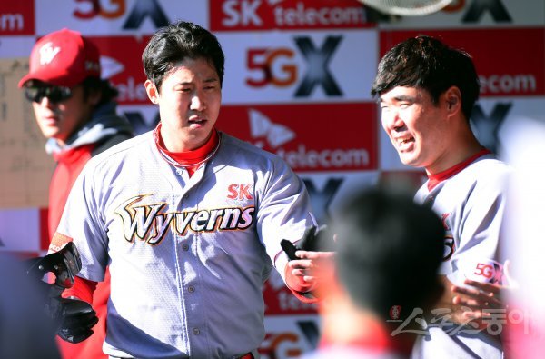 24일 인천 SK행복드림구장에서 ‘2018 신한은행 마이카 KBO리그’ SK 와이번스가 넥센히어로즈와의 플레이오프를 앞두고 자체 청백전 경기를 가졌다. SK 김동엽이 홈런을 쏘아 올린 뒤 동료들의 환영을 받고 있다.