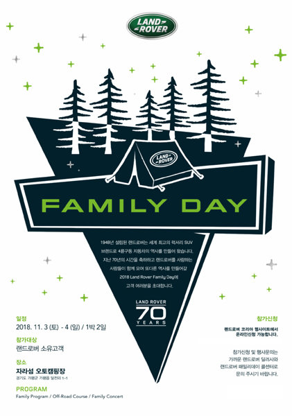 재규어랜드로버코리아는 랜드로버 70주년을 맞아 경기도 가평 자라섬에서 11월3일부터 4일까지 랜드로버 패밀리데이를 진행한다. 랜드로버 패밀리데이는 랜드로버 고객들을 위한 가족 캠핑 행사다. 랜드로버 오너 가족 400팀을 대상으로 진행되며, 랜드로버 패밀리데이 공식 홈페이지에서 예약이 가능하다. 고객들이 참여할 수 있는 오프로드 프로그램과 가수 이승환이 특별 게스트로 출연하는 패밀리 콘서트도 진행된다.