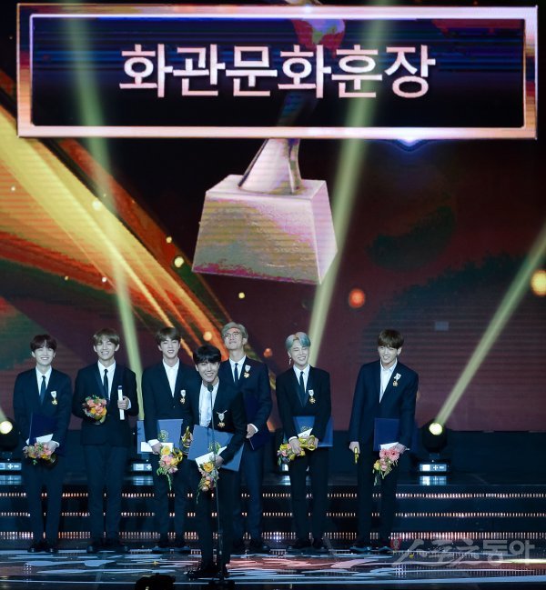 방탄소년단이 서울 송파구 올림픽공원 올림픽홀에서 열린 ‘2018 대한민국 대중문화예술상’ 시상식에서 문화훈장 화관을 수상한 뒤 소감을 밝히고 있다.