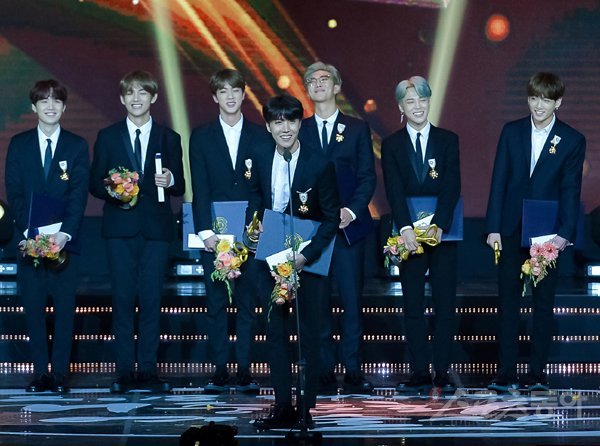 리더인 RM은 “평소 방탄소년단 리더인 관계로 수상 소감을 도맡아 하는데 오늘은 멤버 다같이 수상 소감을 말할 수 있어서 너무 좋다”며 “아미(팬클럽)에게 영광을 돌리고 싶다”고 말했다. 진은 “화관문화훈장 너무 감사하다. 우리가 해외 자주 나가는데 많은 분이 한글로 우리 노래를 따라 불러주시고 한글 공부도 많이 해주셔서 감사하다”며 “앞으로도 우리 문화를 알리는데 노력하겠다”고 전했다.