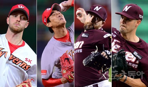 양 팀의 ‘원투펀치’가 정면충돌한다. SK 와이번스와 넥센 히어로즈는 27일부터 플레이오프(PO·5전3선승제)를 치른다. 긴 휴식을 취한 SK는 물론 준PO를 4경기 만에 통과한 넥센도 총력전이 가능하다. SK 메릴 켈리∼김광현, 넥센 에릭 해커∼제이크 브리검(왼쪽부터)이 1∼2차전 선발로 나설 예정이다. 스포츠동아DB