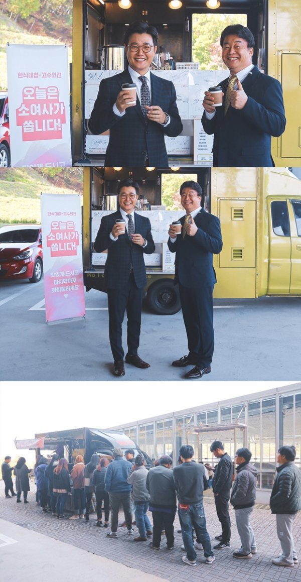이날 촬영에 임한 스태프들은 소유진의 선물을 받고 훈훈한 분위기 속에서 촬영을 이어갔다는 후문이다. 소유진의 남편이자 \'한식대첩-고수외전\'에서 심사위원을 맡고 있는 백종원, 그리고 MC 김성주가 커피차 앞에서 환하게 미소 짓고 있어 흐뭇함을 더한다.