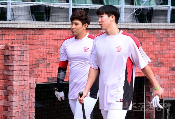 28일 인천 SK행복드림구장에서 ‘2018 신한은행 마이카 KBO리그’ SK 와이번스와 넥센 히어로즈의 플레이오프 2차전 경기가 열린다. 실내훈련을 마친 SK 강승호와 최항이 이야기를 나누고 있다.