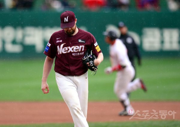 넥센 선발 해커가 5회말 2사 SK 김강민에게 역전 중월 솔로 홈런을 허용한 후 고개를 떨구고 있다.