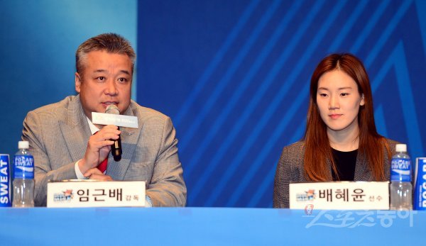 29일 서울 63빌딩에서 ‘우리은행 2018-2019 여자프로농구’ 미디어데이가 열렸다. 삼성생명 임근배 감독이 배혜윤과 참석해 출사표를 밝히고 있다.