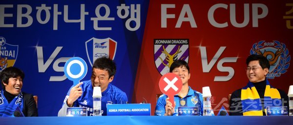 29일 서울 신문로 축구회관에서 ‘2018 KEB 하나은행 FA CUP’ 4강 미디어데이가 열렸다. 수원 염기훈과 울산 박주호가 왼발의 달인을 묻는 질문에 각각 O, X를 들고 있다.