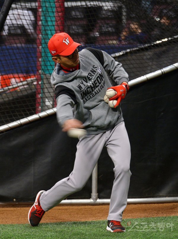 경기를 앞두고 SK 박경완 코치가 포수들에게 공을 던져주고 있다.
