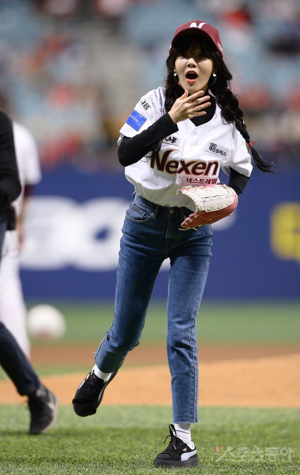 AOA 지민이 경기 전 열린 시구행사에서 공을 던진 후 놀란 표정을 짓고 있다.
