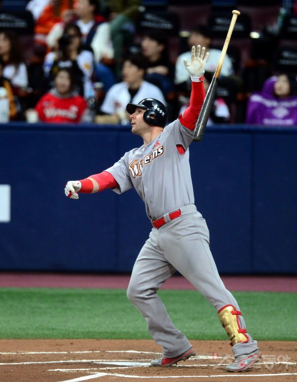 2회초 무사에서 SK 로맥이 넥센 선발 한현희를 상대로 우월 솔로 홈런을 쏘아 올리고 있다.