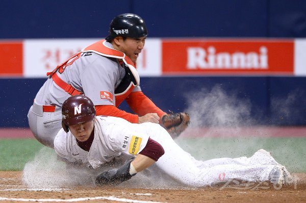 5회말 무사 3루에서 넥센 김혜성이 송성문의 중견수 희생플라이 때 홈으로 쇄도해 세이프 되고 있다.