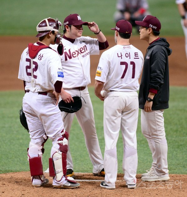 선발 투수로 등판한 넥센 한현희가 6회초 1사 만루 상황에서 교체되고 있다.