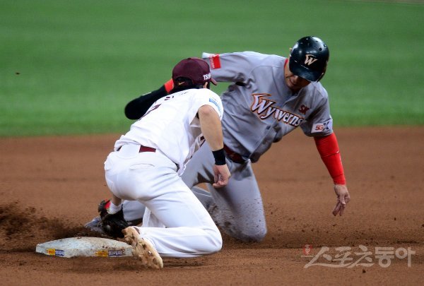 8회초 무사 1루에서 SK 한동민 타석 때 1루 주자 김강민이 2루 도루에 성공하고 있다.
