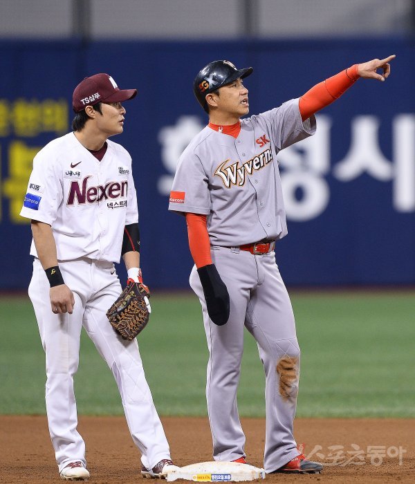 SK 김강민과 넥센 김하성(왼쪽)이 8회초 무사 1루에서 도루 시도 후 SK측 요청으로 열린 비디오 판독을 보며 대화를 하고 있다.