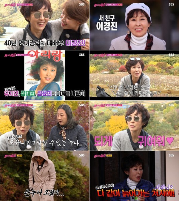 30일 방송된 SBS ‘불타는 청춘’에서는 멤버들의 춘천 여행기가 그려졌다. 이날 공개된 새 친구는 연기 경력 44년에 빛나는 국민 배우 이경진. 그는 출연 계기에 대해 “드라마 ‘파도야 파도야’를 하면서 되게 힘들었다. 2~3시간 쪽잠을 자면서 대사를 외우곤 했는데 선영이는 녹화를 먼저 끝내고 가더라. ‘불타는 청춘’에 간다고 했다. 부러웠다. ‘내가 너 좀 쫓아가면 안 되느냐’고 말하기도 했다”고 밝혔다.