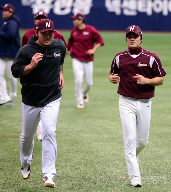 31일 서울 고척스카이돔에서 ‘2018 신한은행 마이카 KBO리그’ 넥센 히어로즈와 SK 와이번스의 플레이오프 4차전 경기가 열린다. 경기에 앞서 넥센 박병호와 김하성이 몸을 풀고 있다.