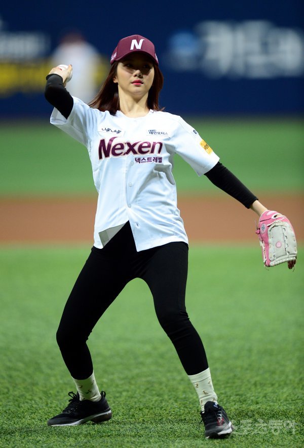 프로듀스 48의 이가은이 시구를 던지고 있다.