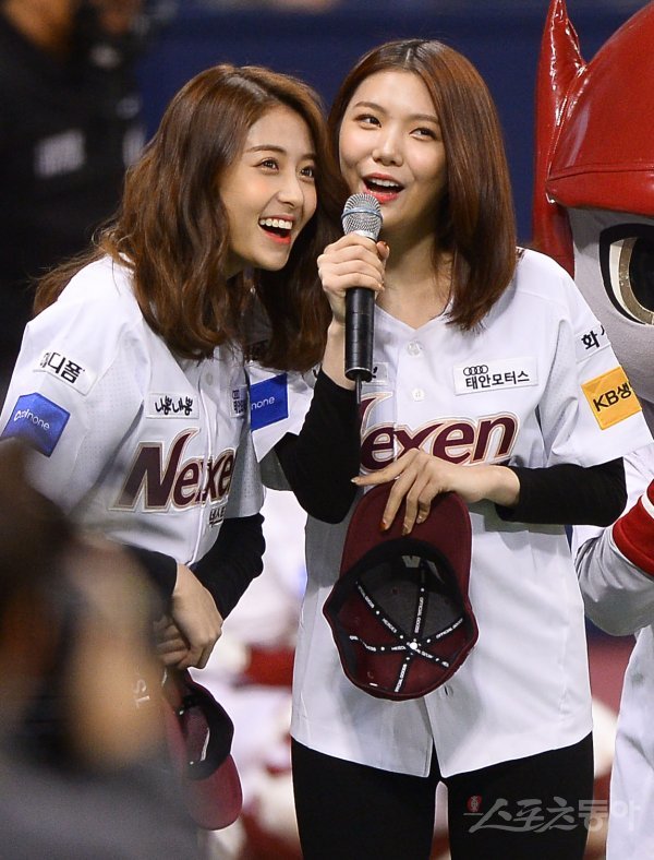 프로듀스48 출신 허윤진과 이가은(오른쪽)이 시구행사 전 인사말을 하고 있다.
