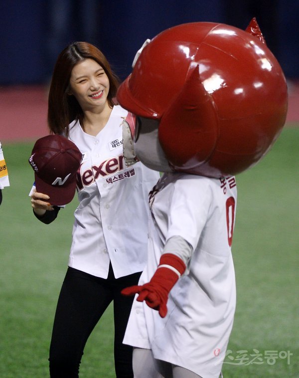프로듀스48 출신 이가은이 시구행사를 마친 후 넥센 마스코트 동글이와 장난을 치고 있다.