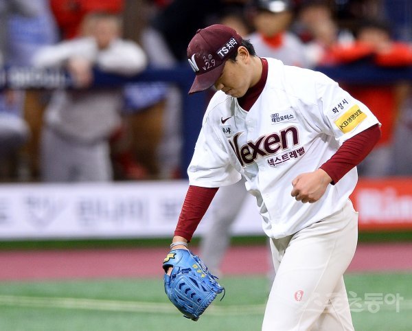 넥센 선발 이승호가 4회초 2사 1,2루에서 SK 강승호를 삼진으로 잡으며 이닝을 무실점으로 막은 후 주먹을 불끈 쥐며 덕아웃으로 향하고 있다.